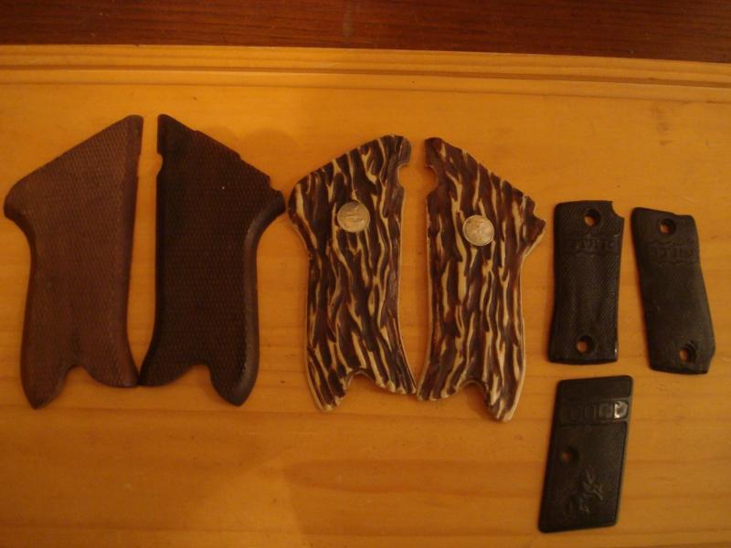 Tres pares de cachas, unas de 08 que posiblemente sean de detonadora, otras 08 que pone "08 luger" ¿? (no las he probado), unas de Star Sindicalista algo arrugadas y otra derecha de Colt 1908 que esta perfecta.