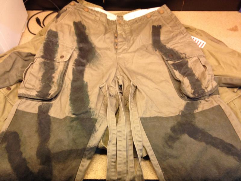 -Pantalones M42 reforzado. Paracaidista US. Pintados para Pathfinder con pintura verde oscuro. Talla L. Precio:25,00€
