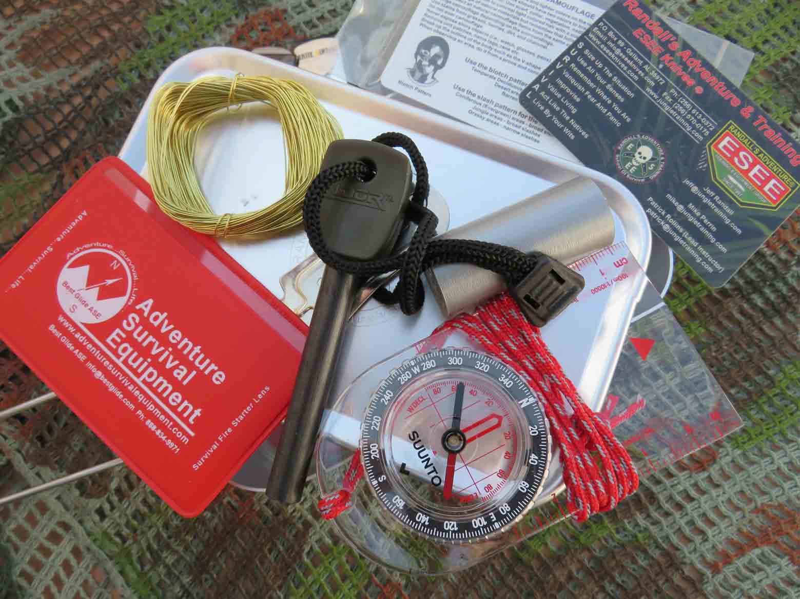 Incluye: cuchillo con funda, brujula, espejo señales, kit de pesca, potabilizador agua y muchas más piezas que lo hacen extremadamente útil. Va en una caja metàl·lica semiaestanca que facilita su transporte y possible uso.