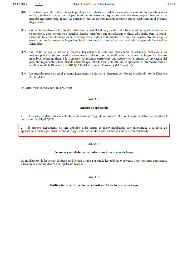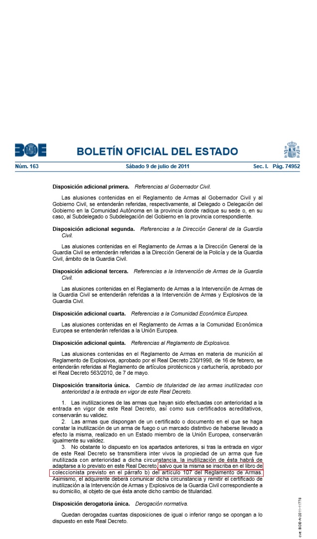 ...Kike, no hay que volver a reinutilizar siempre que inscribas en libro, tal como dice Pepe. Es mas a mi me ha pasado y se ha hecho asi. Compre un cetme L a militaría cantabrico en 2014 con el certificado BOPE a nombre de ellos. Sin pegas, abonado y a mi domicilio. Tras el tema que tuvieron me llamaron de mi IA, pues le había llegado Listado entre los que estaba de compradores a dicha empresa y que por fecha no se ajustaba a la inutilización que debía de tener y que debía de mandarlo al BOPE o depositarlo. Les informe del famoso RD 976/2011 que me amparaba ofreciendo otra posibilidad, cosa que pusieron en duda pero tras enseñárselo y tener que releerlo varias veces, pues lo desconocían totalmente, tuvieron que inscribírmelo sin mas. Es mas dicho RD hace referencia a TODOS los certificados anteriores a la entrada en vigor del RD ya sean españoles o europeos, como validos, sin especificar sean del BOPE, De la GC o de los Parques de Artilleria y mucho menos si son nominativos o no. Como siempre a interpretación del Interventor. Os dejo foto del