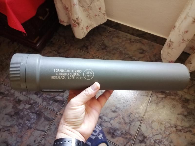 Vendo tubo deposito de 4 granadas de mano Alhambra Guerra Instalaza. Perfectamente conservado, sin suciedad, grietas ni señales de uso.