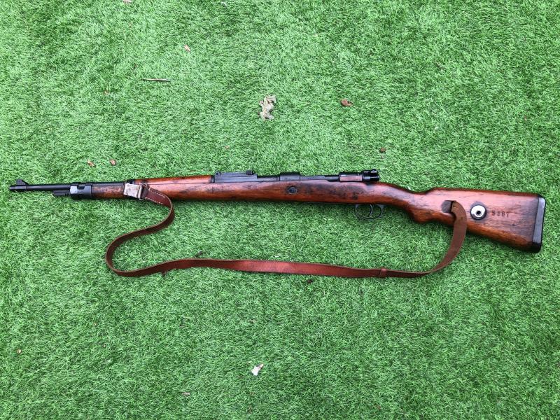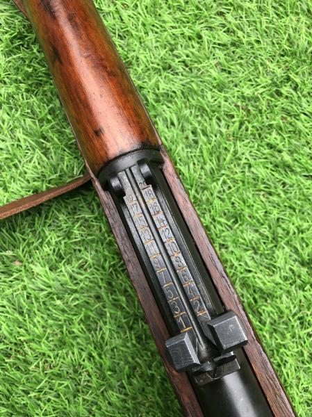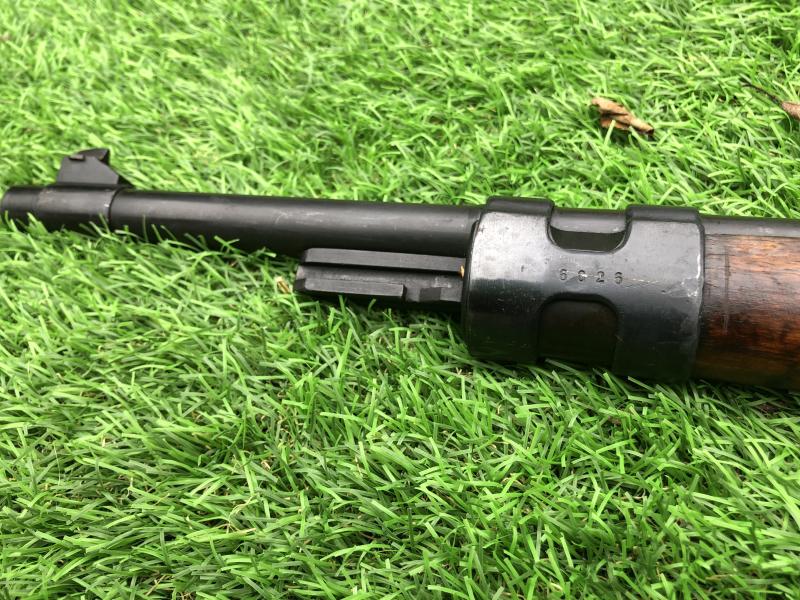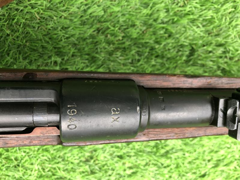 VENDIDO este raro rifle K98 con código "ax" fabricado por Feinmechanische Werke en 1940. Se estima que menos del 1% de los K98 recibieron este código. A mediados de 1940, el código "27" de Erma fue reemplazado por el código "ax" de Feinmechansiche Werke. Se estima que aproximadamente 150.000 rifles K98 se produjeron en 1940 con ambas marcas de cajón de mecanismos con código "27/ax", sin embargo, los rifles K98 con código "ax" son mucho más raros. La parte superior del anillo del cajón de mecanismos está marcada con "ax/40”, el lado derecho está marcado con tres pruebas "eagle/280" de la Waffenamt y el lado izquierdo está marcado con la prueba de tiro nazi y el número de serie 5287.