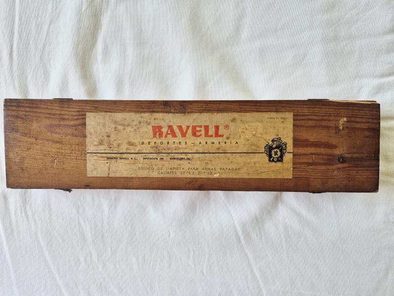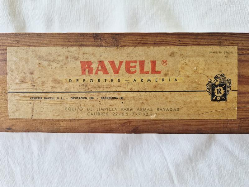 Antiguo estuche en madera de los años 70 para limpieza de armas; etiquetado por la Armería Ravell de Barcelona; la descripción original es que se trata de un equipo de limpieza para armas rayadas de diversos calibres.