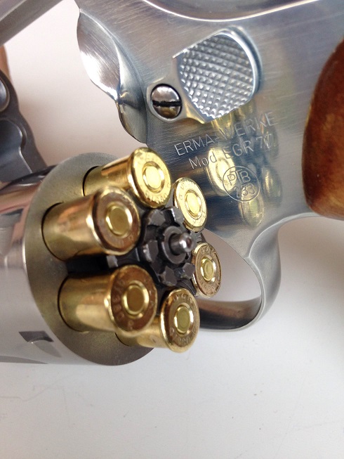 La anilla que veis en la foto tras el tambor es de ACERO y realmente continua por todo el interior del cañón.Se trata, por lo tanto, de un revolver construido para durar todo el tiempo que su dueño considere, a diferencia de las actuales armas de fogueo. Fue construido con la máxima calidad.