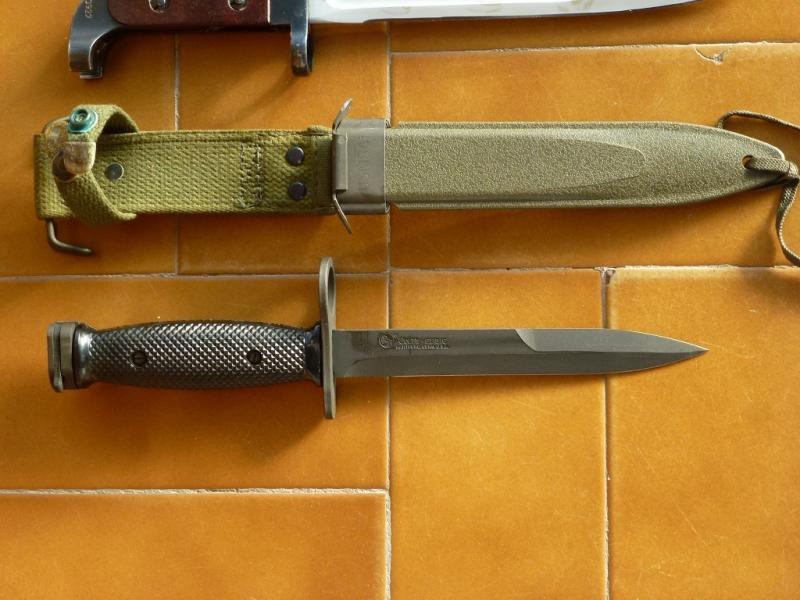 Bayoneta original estadounidense M7 fabricada en Hartford (Connecticut)para el fusil de asalto M-16 usado en Vietnam. Se acompaña de funda de plástico verde granulado, brocal marcado M8A1, tahalí de lona, cordel para atar a la pierna y engarce metálico para ceñidor. Empuñadura de plástico negro. Se encuentra en estado NUEVO sin uso, la hoja de acero parkerizada esta perfecta. Largo total 320 mm, largo de hoja 175 mm, peso total 455 gramos. 70 euros envio aparte