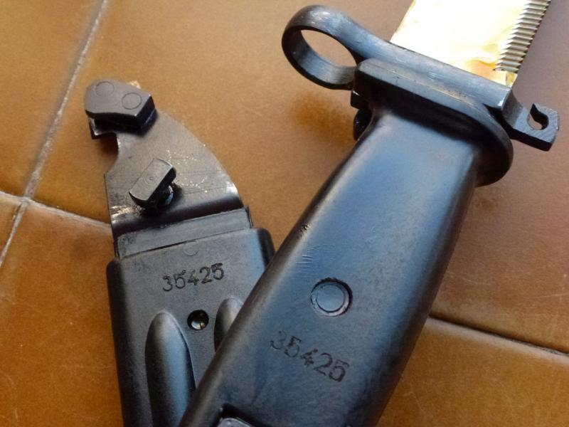 Bayoneta yugoslava AKM tipo II nueva de arsenal correspondiente al fusil de francotirador Zastava M-76 y al fusil M-70, mismo número en bayoneta y funda (35425), con la grasa original de almacén de fábrica en la hoja , sierra y filo perfecto y original de fábrica. Función corta-alambres. 50 euros envio aparte.