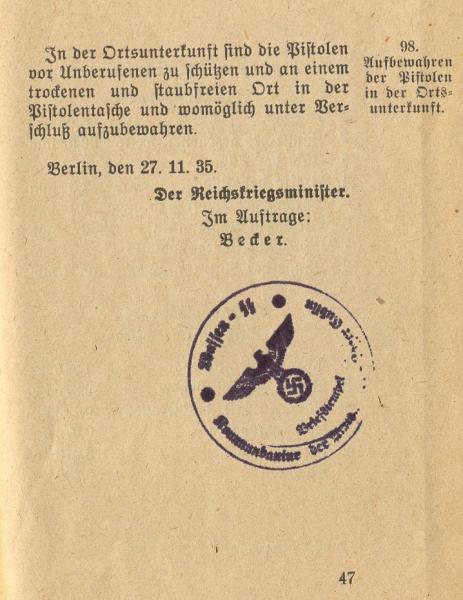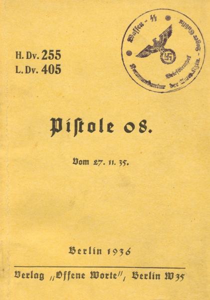 Libro de instrucciones (Heeresdienstanweisung Nr. 255) oficial desde el 27 de Noviembre de 1935 publicado por el Ministerio de la Guerra (Reichskriegsminister). Contiene 48 páginas con instrucciones para el uso de la Luger P.08. Detalles técnicos, como para manejar la pistola, despiece del arma, etc. El libro está cuñado en varias de sus hojas. En el texto del cuño pone Briefstempel Lager Lublin Waffen SS y otras palabras ilegibles. Dudo de su originalidad.
