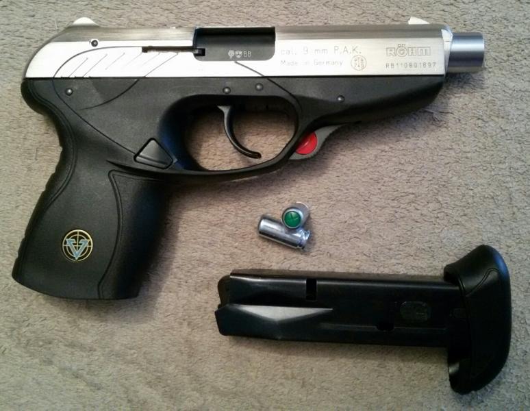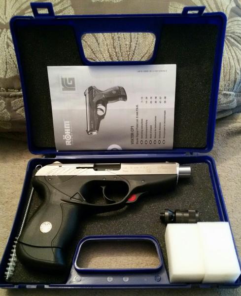 Vendo pistola Vektor CP1 en calibre 9mmPAK NUEVA, recien traida de Alemania. Fabricada bajo licencia por Röhm Germany. En acabado DeLuxe/Acero Satinado. Se entrega con maletín original, instrucciones, baqueta, bocacha para bengalas, 2 cargadores y un embellecedor de cañón específico en acero inox, pues este modelo viene con obstrucción visible.