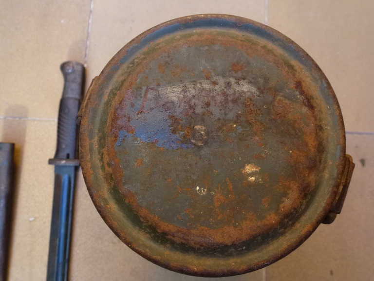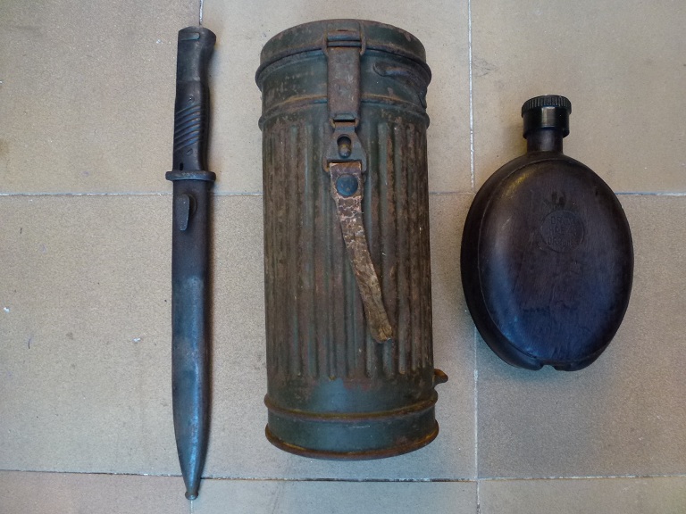 - Lata portamáscara alemana (Gasmaskenbüchse) mod 1938-1945 marcada 1939 MB y con el aguila de la waffenamt, tanto en la tapa de arriba como en la base esta escrito el nombre de su propietario Borgmann.La lata conserva pintura original y como se puede ver esta oxidada.