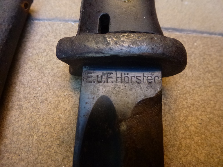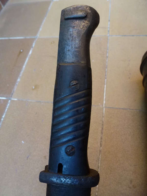 -Bayoneta Kar 98 fabricada por E.u.F.Horster, sin número de serie, cachas de bakelita. El botón pulsador no acciona, funda metálica con oxido.