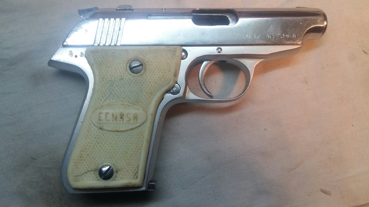 Vendo Pistola Española marca ECHASA inutilizada por fresado en recamara para poner en libro de coleccionista 150e + portes si es fuera de Madrid.