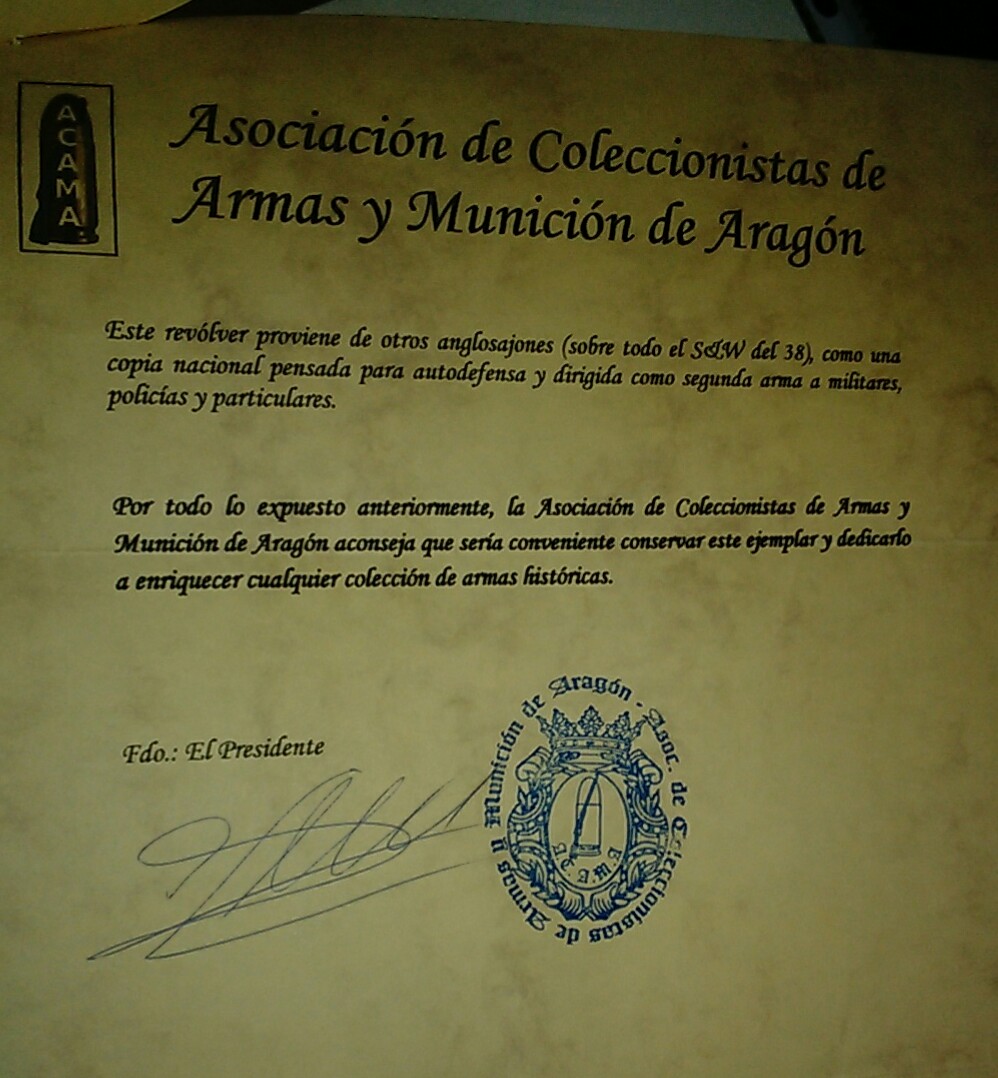El certificado histórico al que, imagino, hace referencia el vendedor, es a que dicha arma está inscrita como "arma histórica" en base a unos hechos y circunstancias expuestos en dicho certificado por el organismo o autoridad que lo expide y firma. Hace años se expedian certificados de este tipo y se inscribian en Libro de Coleccionista con relativa facilidad incluso armas cortas de gran serie o de dotación del tipo Astra A-80/A-90, Star 30M, Berettas 92 FS o revólveres LLama o como el que se expone...cosa que a día de hoy ya no ocurre.