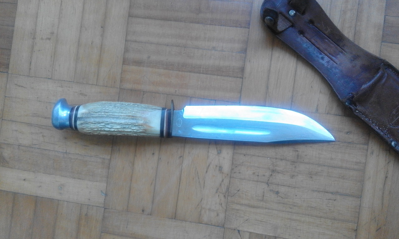 El cuchillo tiene el mango de asta de ciervo, es de la marca GEBR. WEYERSBERG SOLIMGEN, debe tener unos cuarenta años, la funda esta algo deteriorada por el tiempo, pero es la original. Precio 50 euros mas portes.