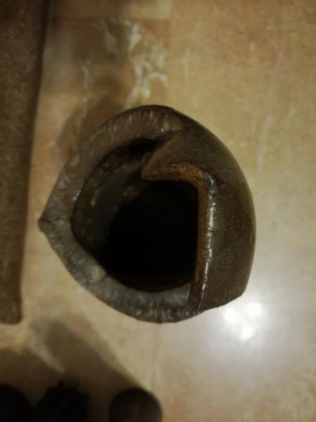 Proyectil de artilleria de la guerra civil. Tal y como se ve en la foto, no tiene ningún peligro ya que es solo hierro. Conserva restos de pintura naranja.