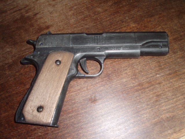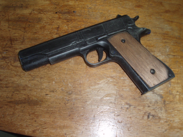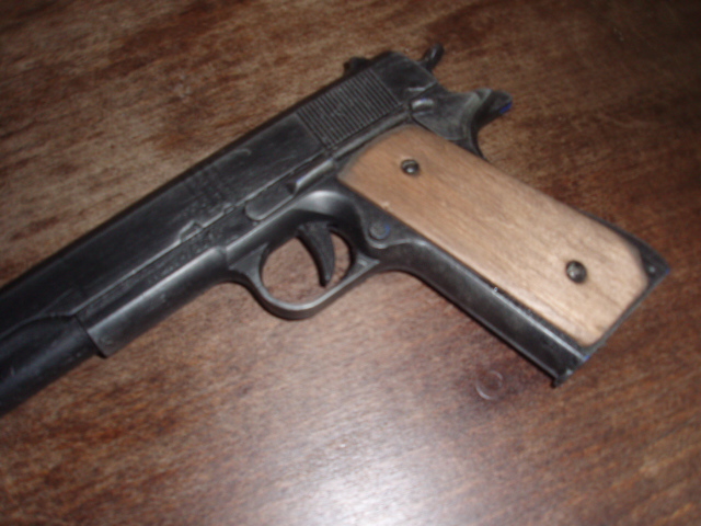 Colt mod. 1911 en plástico y cachas de madera. TOTALMENTE INERTE, ni detona ni airsoft, ni siquiera de agua. :D