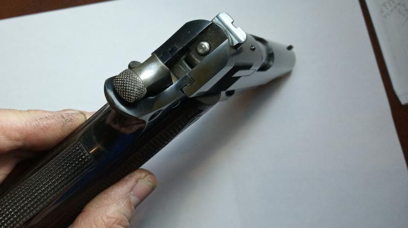 En esta última imagen se aprecia como un leve cambio de color del pavón, en mano casi no se nota, no es de desgaste, puede ser que en fabrica en esta zona no lo aplicaron con tanta intensidad, tiene su brillo y no esta rozada, es como menos intenso.