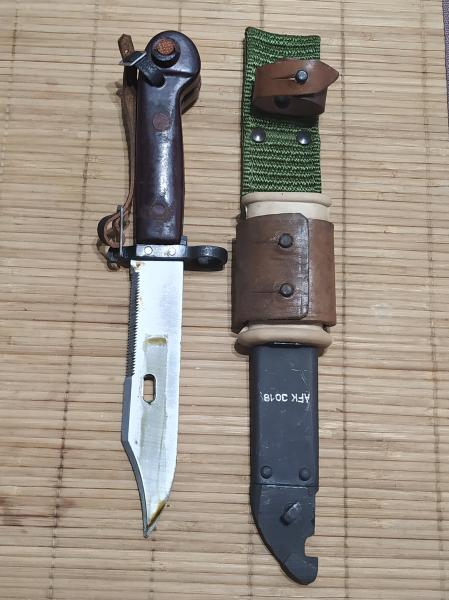 Bayoneta rumana AKM tipo I introducida apartir de 1959, función cortalambres, sierra en la parte superior y la hoja con filo original, tahaliz mixto de canvas y cuero, muy buen estado y números coincidentes,completa con fiador de mano.