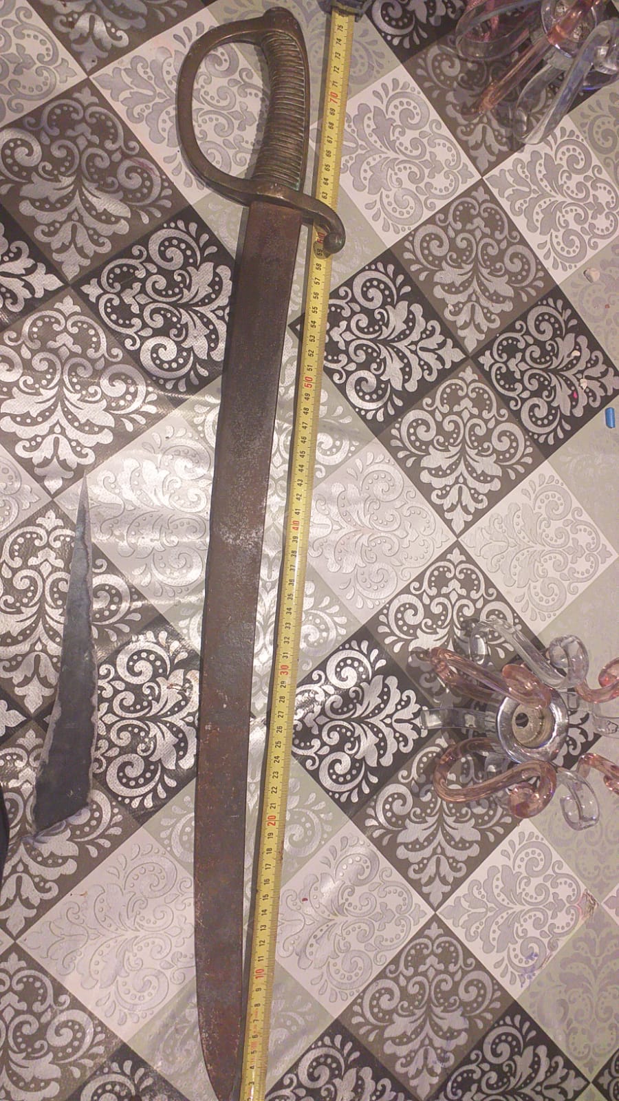 Las medidas de la hoja son 60 cm exactos y la empuñadura 13.5 cm, te envío más foto y el año es 1836.