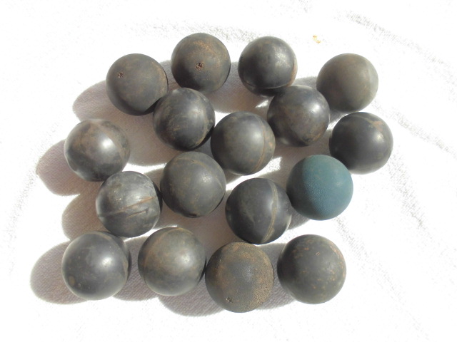 Lote de pelotas antidisturbios, 17 en total, usadas, recogidas en un campo de prácticas, están en diferente estado según el tiempo que han pasado a la intemperie, son de tamaño mayor al de un pelota de golf, pero menor al de una pelota de tenis, bastante pesadas, hay una de color azul.