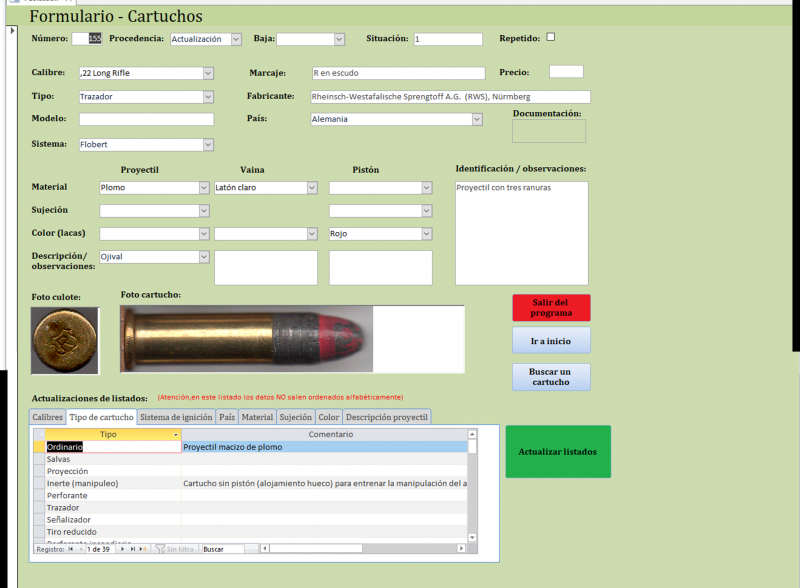 Por mudanza a una casa más pequeña, vendo mi colección de cartuchería. Son más de 1300 cartuchos cargados en una base de datos que va incluída en el precio, y puede sacar varios modelos de listados, entre ellos el libro de coleccionista y el que aparece aquí. Está preparada tanto para cartuchos como para cajas (que yo no colecciono)