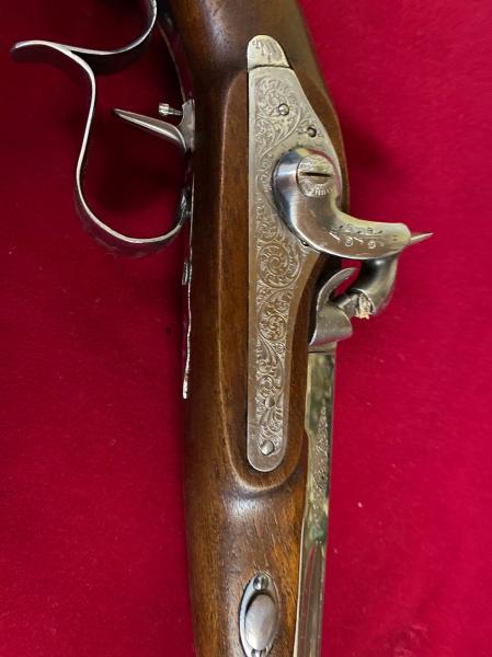 Pareja de pistolas de duelo muy utilizadas durante la segunda mitad del siglo XIX. Incorporan cañón acanalado, culata de Nogal bellamente talladas, disparador de pelo ajustable, alza regulable y punto de mira de hoja. En calibre 45 percusión. Estas pistolas se presentan en un elegante estuche de madera noble especialmente adaptado para estas dos pistolas, con sus correspondientes accesorios de carga. NO SE HAN DISPARADO NUNCA.