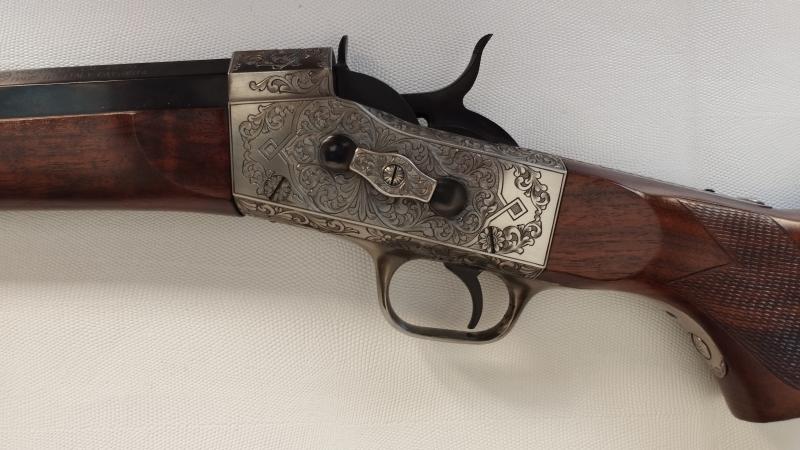 Rifle Rolling Block de Pedersoli de lujo, el más alto de gama, profusamente grabado, maderas seleccionadas, en calibre 45/70.
