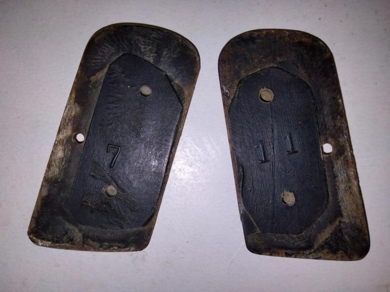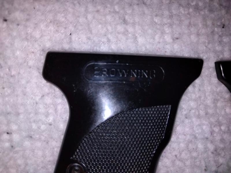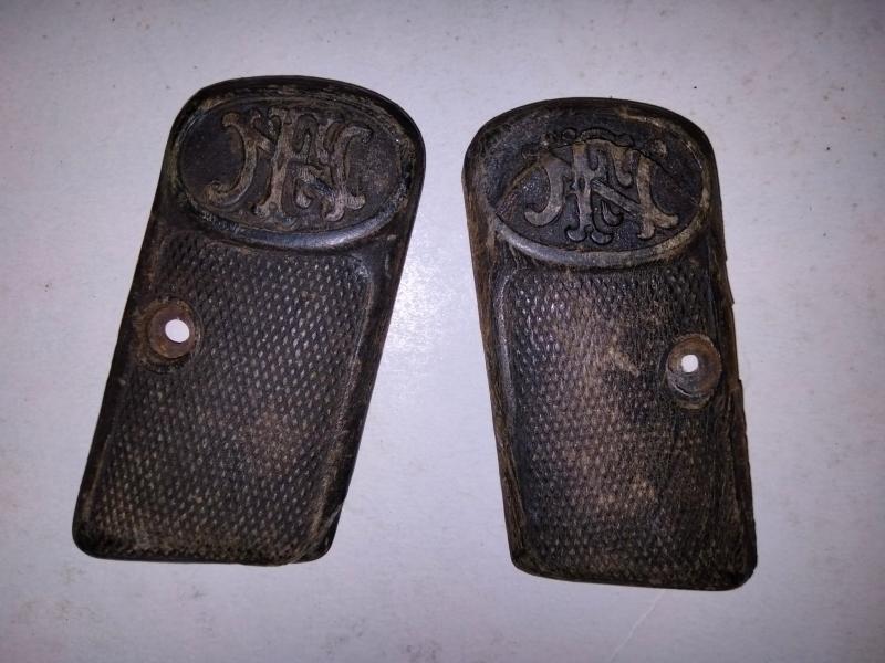 empiezo por este par de cachas de FN Browning 1906 del calibre 6,35 , sin tornillo ni tuerca de amarre y con una tara en una de ellas , pues esta rajada hacia afuera en la parte de arriba