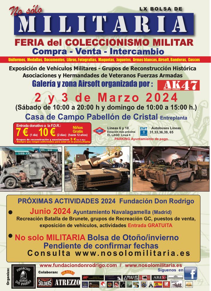 La Fundación Don Rodrigo organiza la mayor feria de coleccionismo militar con 4.000 metros cuadrados de exposición y Compra-Venta-Intercambio de todo tipo de artículos militares, exposición de vehículos militares, grupos de reconstrucción histórica, asociaciones y hermandades de las Fuerzas Armadas, galería de airsoft. Se celebrará el fin de semana del 2 y 3 de marzo (Sábado de 10:00 a 20:00 horas y domingo de 10:00 a 15:00 horas) en la entreplanta del Pabellón de Cristal de la Casa de Campo. Entrada donativo 7 euros 1 día 10 euros 2 días. Niños gratis.