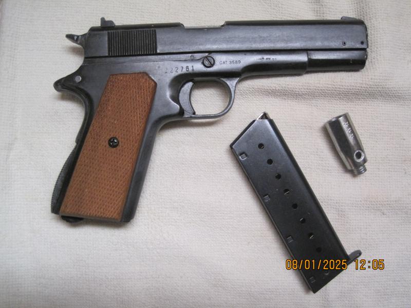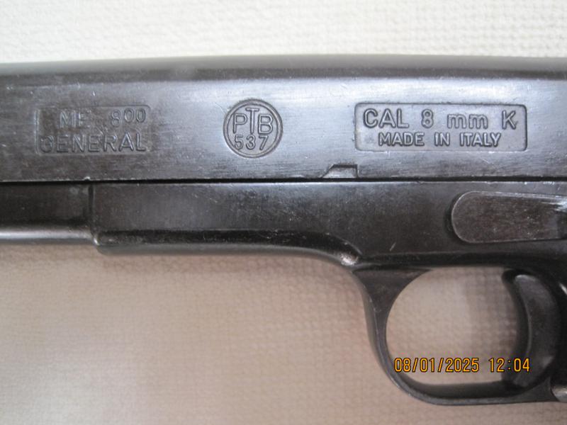 1ª ---- Pistola DETONADORA, marca ME 800 GENERAL, calibre 8 mm K, MADE IN ITALY .. réplica de la 1911, muy simple, la palanca de retenida no tiene otra función que retener la corredera manualmente, ya que cuando se dispara el último cartucho la recamara no queda abierta por la acción de esta palanca. El botón para extraer el cargador también es ficticio ya que realmente se saca por medio de otro botón/mecanismo que se halla debajo de la pistola por donde entra y sale el cargador, al igual que la palanca de seguro que es fija.