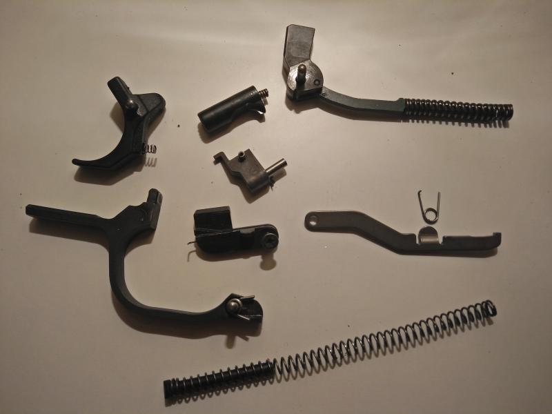 Fotos del piecerío (Corredera entera con alza micrométrica, contrapeso, disparador, guardamontes, botón del cargador, palanca de retenida, martillo y demás piezas cuyo nombre desconozco ,con sus pasadores y sus muelles)