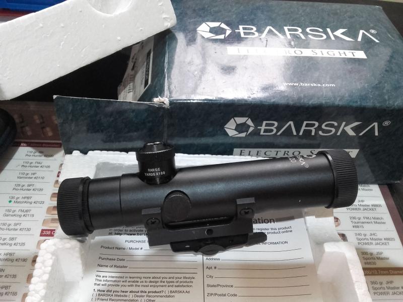 Visor Barska, de cuatro aumentos fijos, réplica de los antiguos Colt x4, funciona perfectamente.