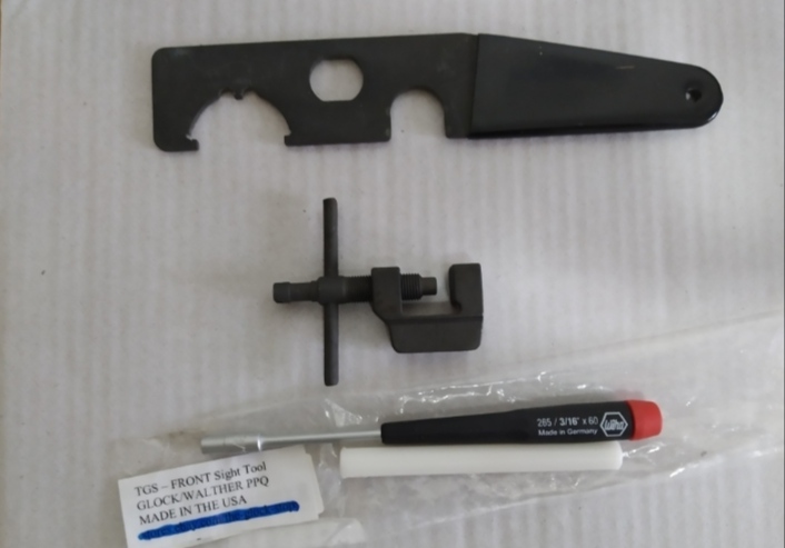 Llave Allen de pared fina especial para quitar el alza de las Glock y de la Walther PPK y botador de teflón para sacar alzas en cola de milano. Kit comprado en EEUU y llave de fabricación alemana, 20€ portes pagados