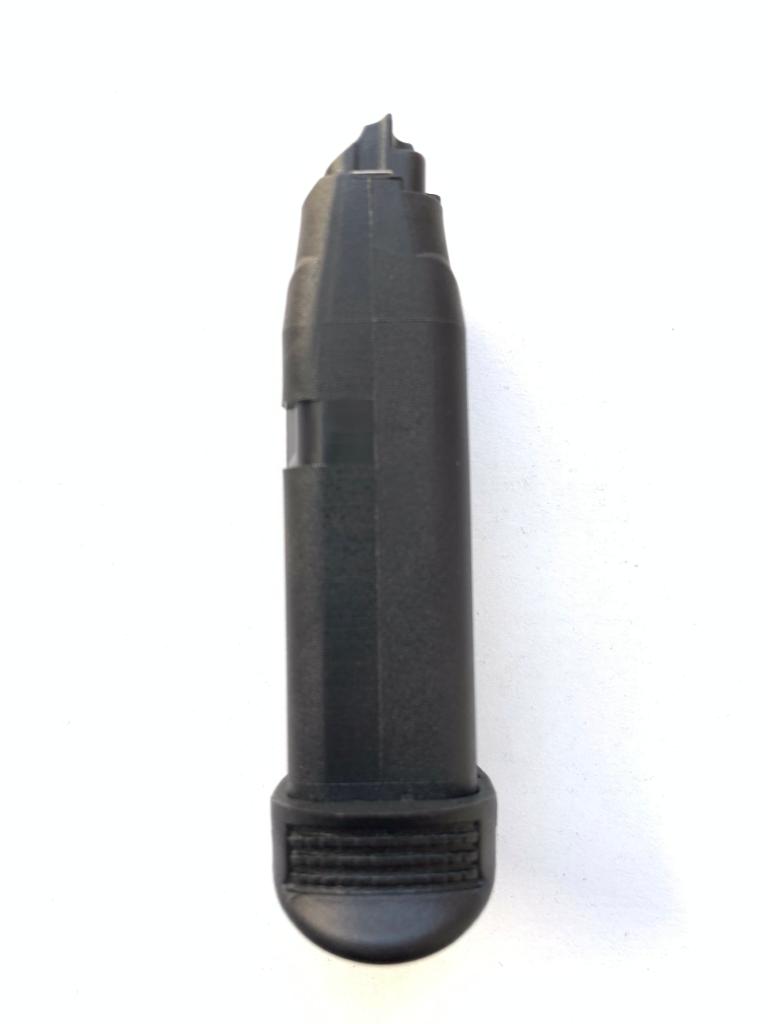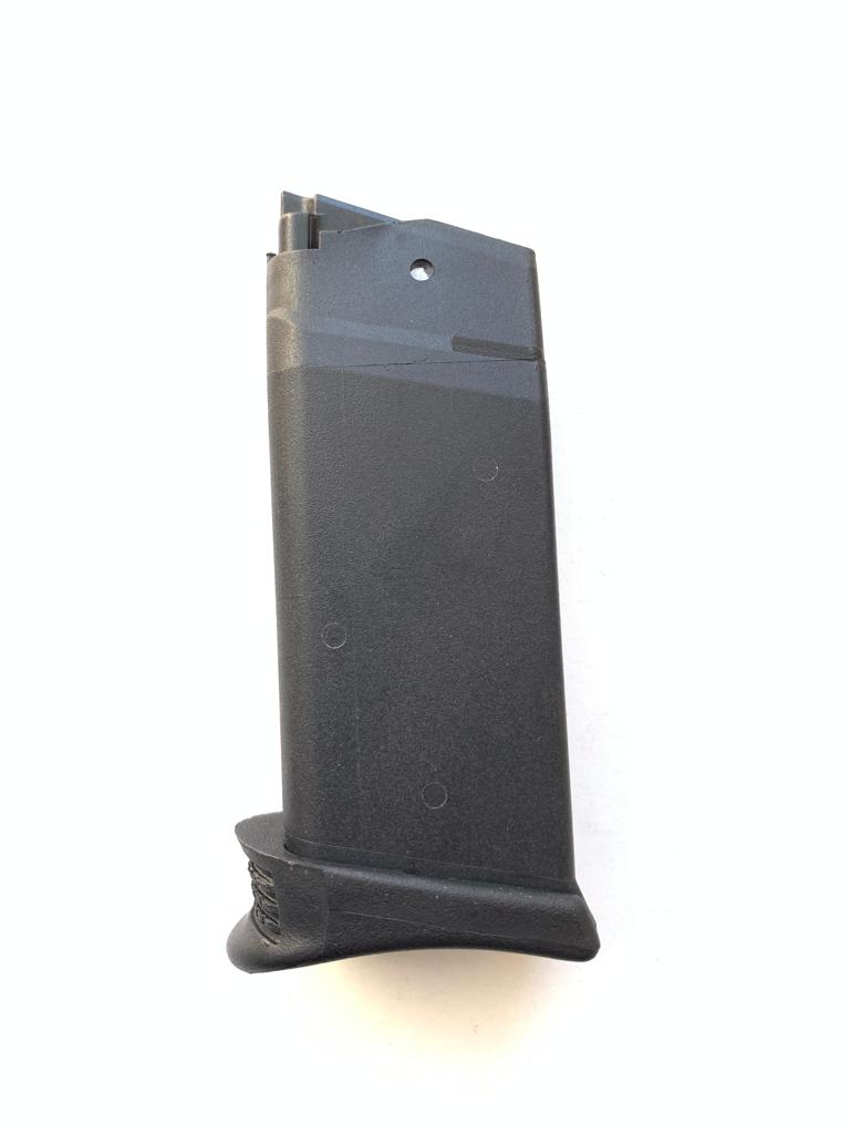 Capacidad: 9 Cartuchos, al que se le ha dotado de una extensión para un mejor empuñamiento del arma con el cargador insertado.