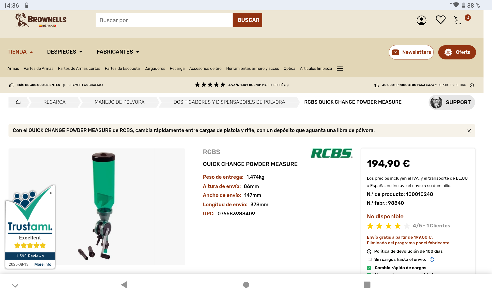 pólvora sin humo. La tolva grande puede acomodar 2 libras de