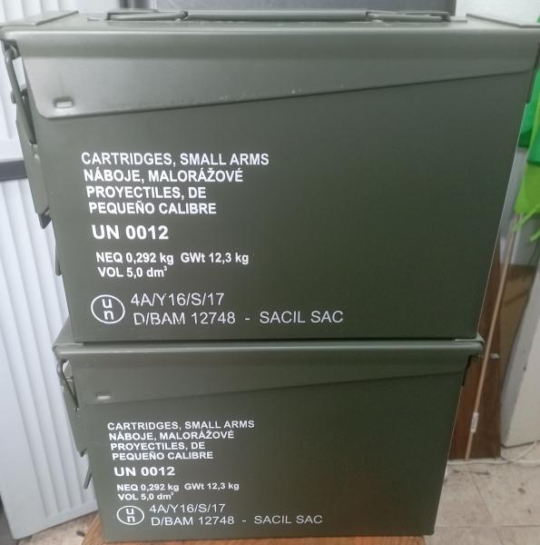 Lote de dos cajas metálicas de munición, estado excelente tanto el metal como la goma estanca ,tamaño aproximado: Largo 26,5 cm x Alto 18 cm x Ancho 9,5 cm. Precio del lote 45€, envío peninsular incluido.