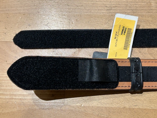 Cinturón Safariland sin usar, Sirve para IPSC o para el servicio. Se compone de cinturón interior con velcro que se sitúa en el pantalón y tiene unas dimensiones de 3,8 centímetros de ancho y 135 de largo, y cinturón exterior de cuero en tono negro que, con unas dimensiones de 5,8 cm de ancho y 135 de largo, se sitúa sobre el anterior gracias a un velcro interior.