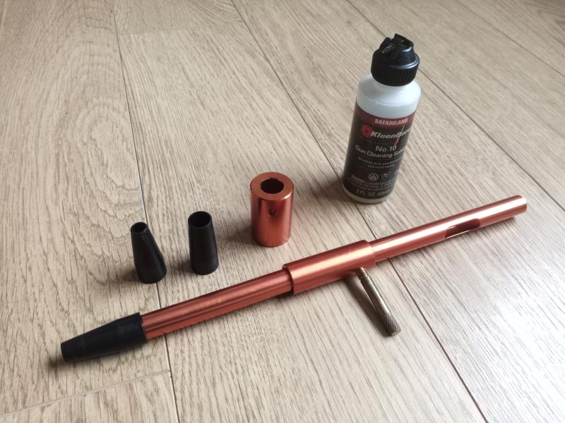 Guía de Limpieza universal viene con un juego de puntas intercambiables que cubren los tamaños de orificio desde el .17 hasta el .416. Las boquillas de rosca impiden que la guía se adhiera a la recamara.