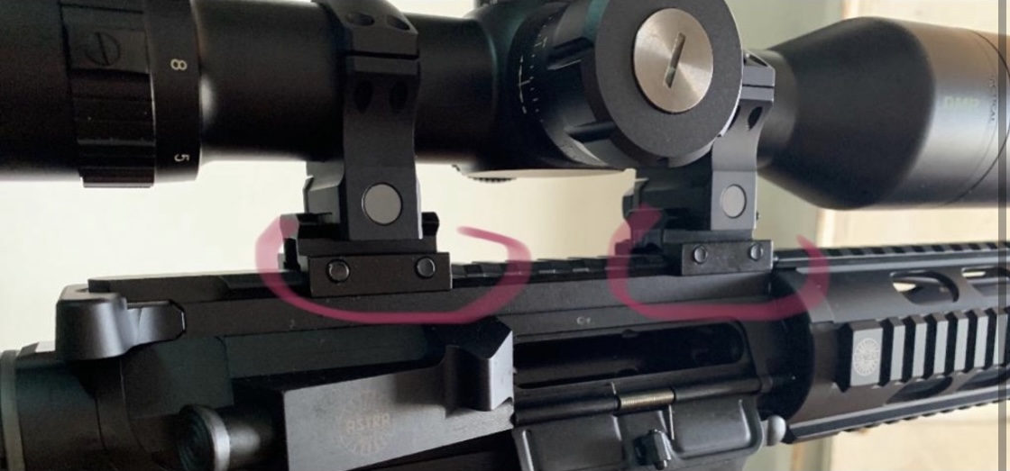 Como ejemplo, en un AR 15 de Picatinny muy largo, de esos que se extienden por debajo de la campana, como el de la siguiente foto, hay que instalar las anillas con elevadores opcionales (marcados en rosa) para que la parte de abajo de la campana no pegue en la superior del Picatinny.