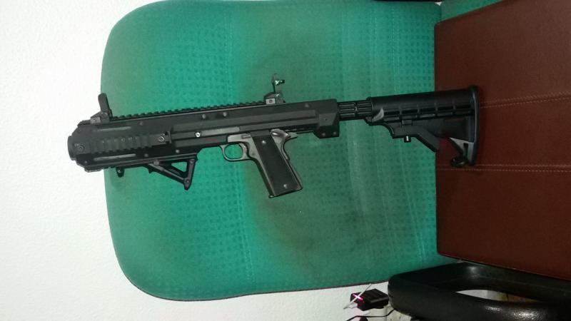 El kit básico me costo traerlo casi 300€ y viene pelado, solo trae el cuerpo y los raíles, la culata es de paintball y las miras son de airsoft (no quiero engañar a nadie), el agarre delantero me lo regalaron y no tengo ni idea de que sera (se ve robusto), pero dado el escaso retroceso que suponen el 45acp y el 9pb aguantan perfectamente.