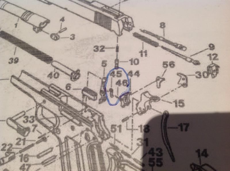 Hola amigos,a ver si alguien me pudede ayudar a encontrar estas piezas que por avatares de la vida se han extraviado ,se trata de el depresor y el muelle de una GOLD CUP series 80 del 45,si alguien las tuviera o me dijera donde comprarlas le estaría muy agradecido son la 45 y la 46,a continuación pongo unas fotos,saludos