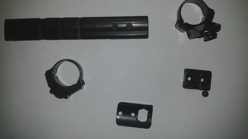 Se venden bases y anillas giratorias apel originales. Incluyen una montura para visor holográfico Bushnell. Estaban montadas en un rifle FN BAR. Están en un estado excelente. El precio del conjunto de anillas y bases es de 220 euros.