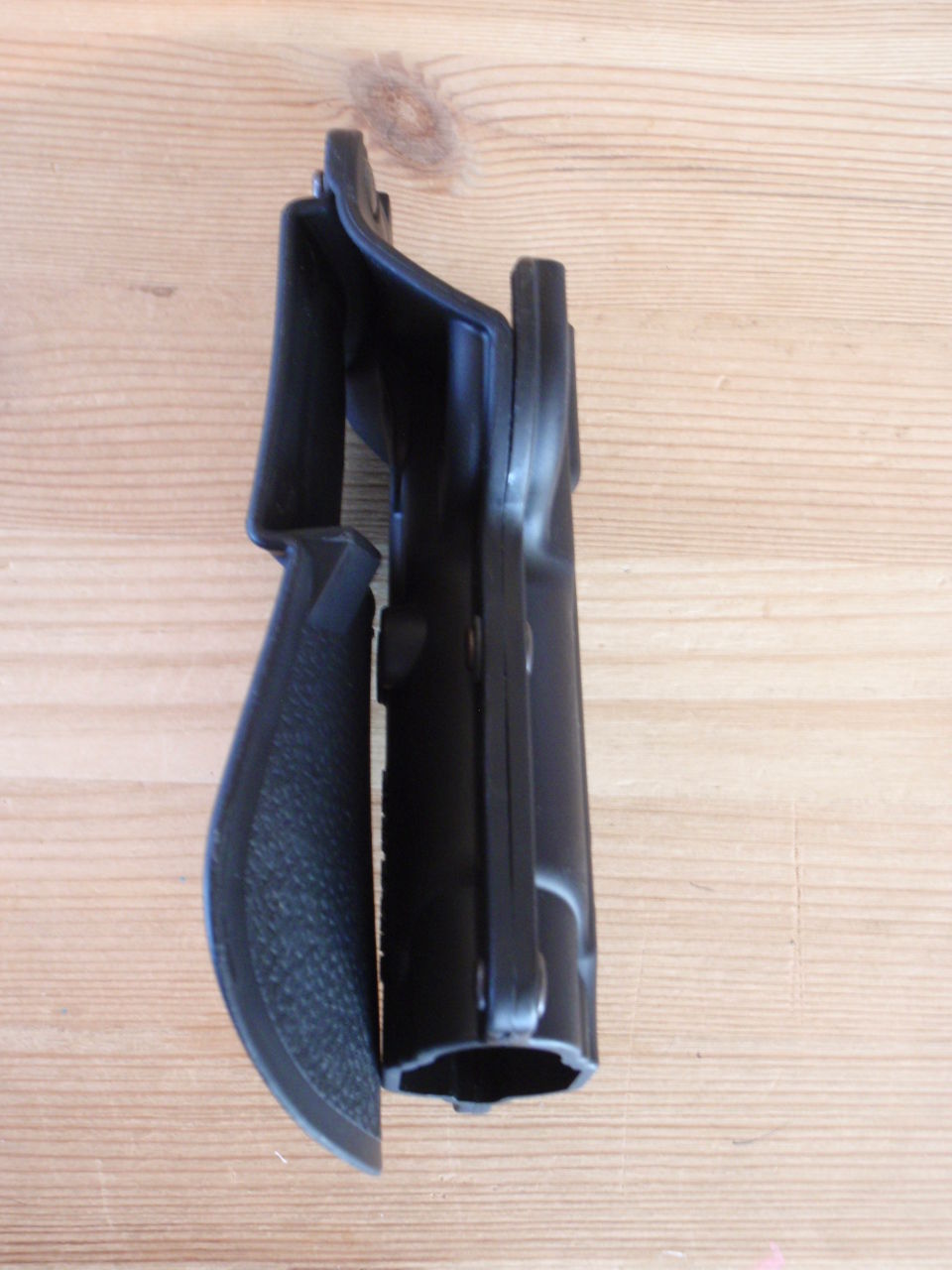 - Información técnica: Funda fabricada en polímero moldeado por inyección. El sistema de retención pasiva actúa como un resorte en la zona del guardamonte y sostiene el arma de manera firme en su lugar.