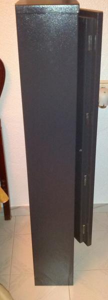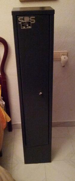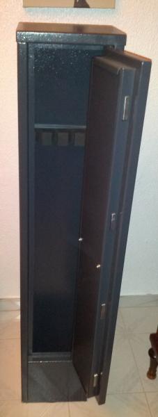 Caja fuerte SPS-I para cuatro armas largas. Capacidad 52 litros. Medidas exteriores: Alto 1300 mm. Ancho 250 mm. Fondo 200 mm. Muy poco uso, prácticamente impecable.