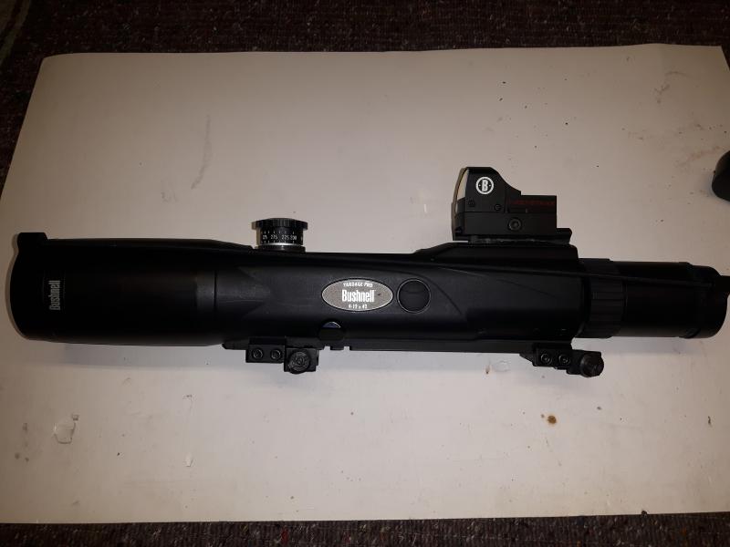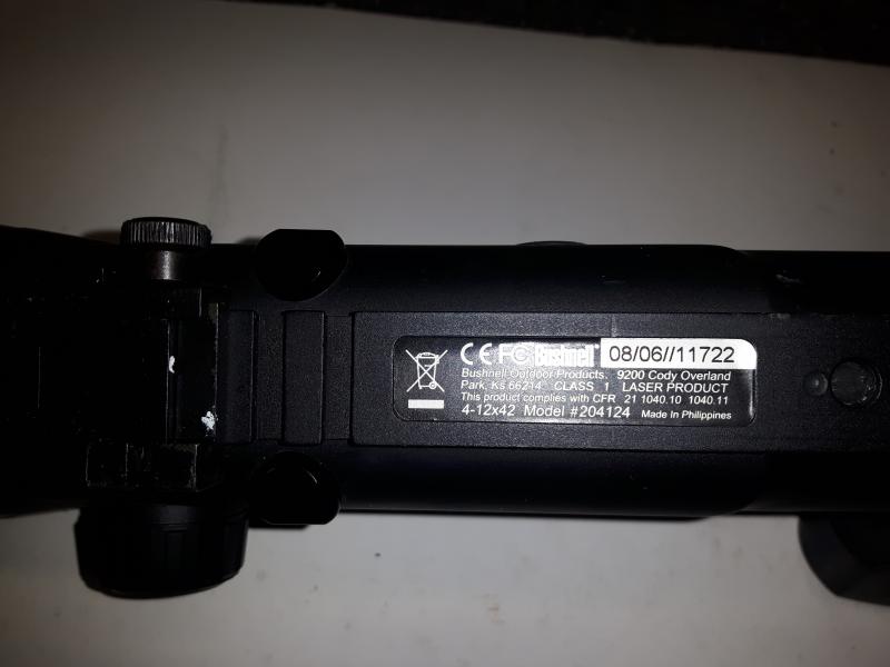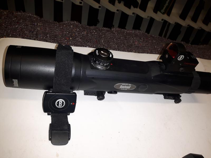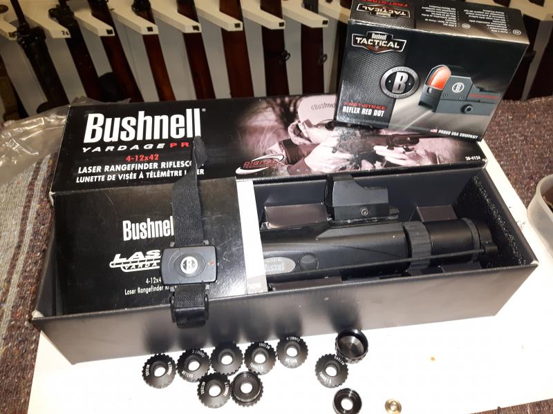 Visor de 4-12x42 mm, telémetro láser y compensador de caída, - óptica con multitratamiento completo. -100% resistente al agua y al empañamiento. -Distancia del ojo al ocular de 89 mm. -Valor de clic de elevación y deriva de . 25. -Retícula Mil-dot. -Peso sólo 68 0, 4 gr. -Alcance de 30-730 m. -Precisión +/- 1 m. -Modo estándar y SCAN. -Botón de activación inalámbrico. Torretas intercámbiales según el calibre. Incluye un Punto rojo Bushnell Firts Strike adaptado para tiros rápidos. Lo tenia montado en un 7-08 que vendí por dejar la caza.