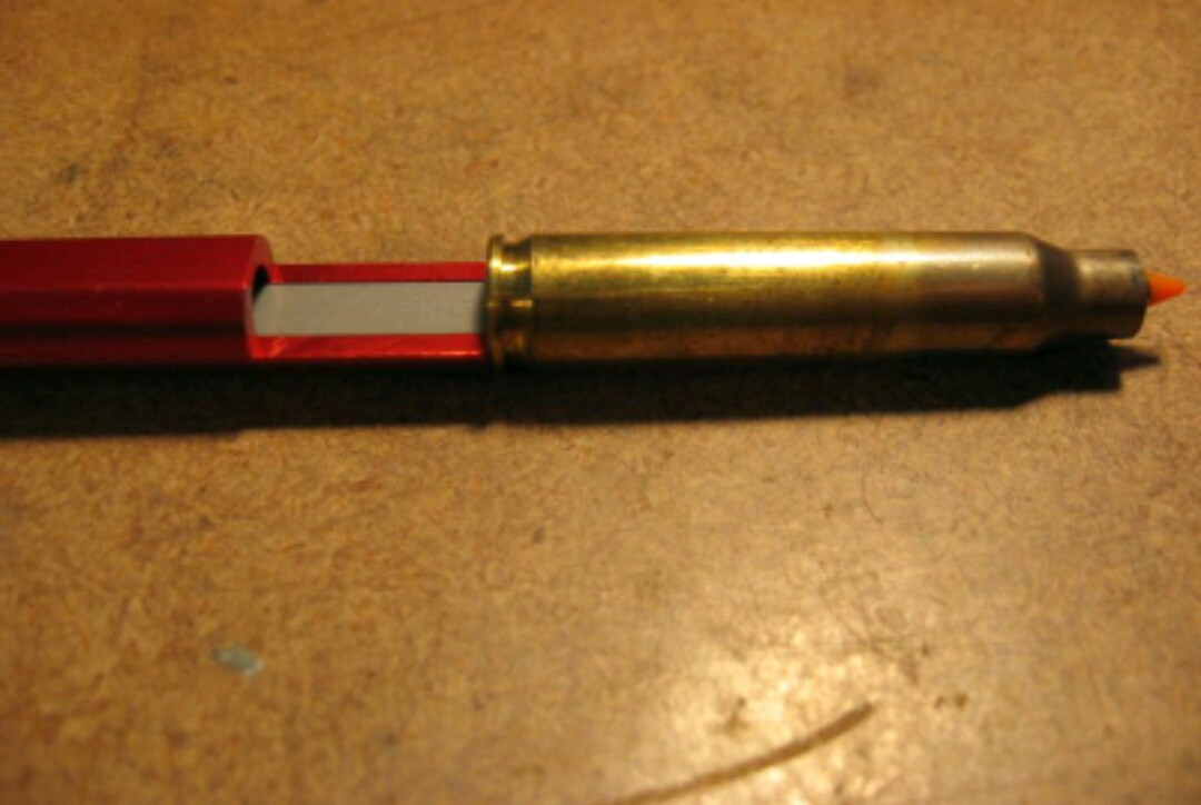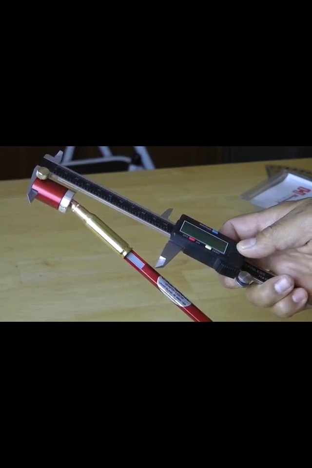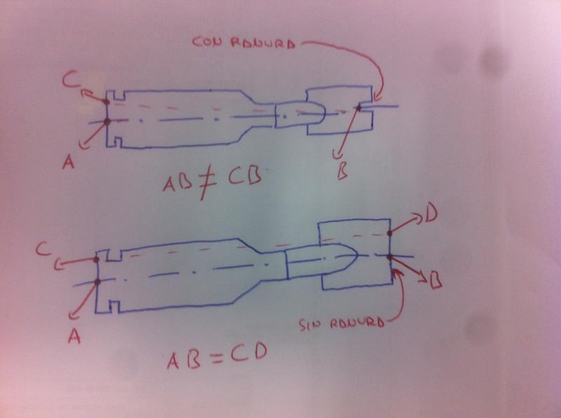 Es sencillo, sí el de hornady no tuviese la ranura para sujetar con el prisionero la pata del calibre, la sonda no necesitaría el rebaje del que hablamos. Al tenerla estas obligado a medir en en los puntos de intersección del eje de la bala con los dos planos el del culo del casquillo y el de la ranura donde se sujeta la pata del calibre, para que como indicaba el compañero la medida sea correcta.
