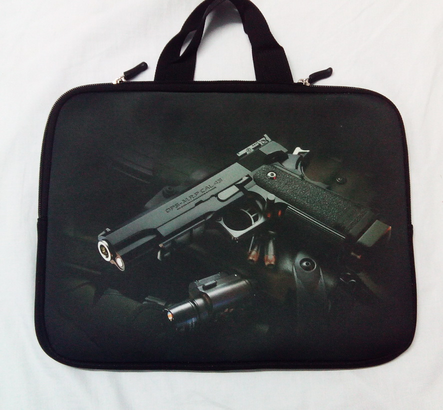 VENDO cartera o bolsa de neopreno, para transporte de armas o accesorios, con impresión en ambas caras de motivo relacionado con el tiro. Con asas escamoteables. Medidas 32 x 24 cm.