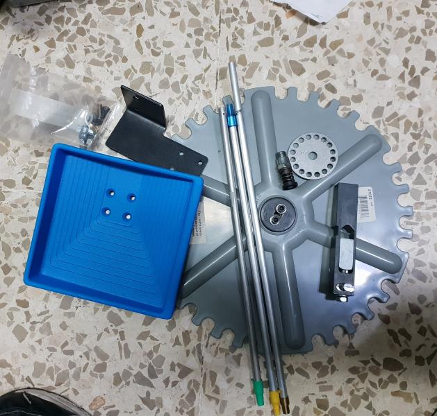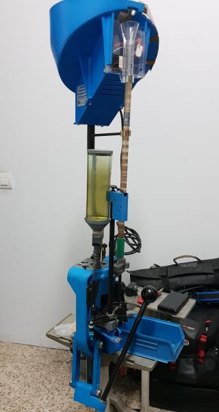 El conjunto es, la prensa con el kit para el calibre 9mm, tolva para vainas, dos platos para la tolva, el LP y el SP, los dos kit para pistones LP y SP, chivato de pistones, tubos madres del empistonador para los dos tamaños, un tubo para recoger pistones SP y otro LP, dos guillotinas del dosificador para calibres pequeños y grandes, incluyo bandeja para las puntas sin uso, a estrenar, no está puesta porque esta se coloca sobre el pié de Dillon que es opcional y no lo tengo.