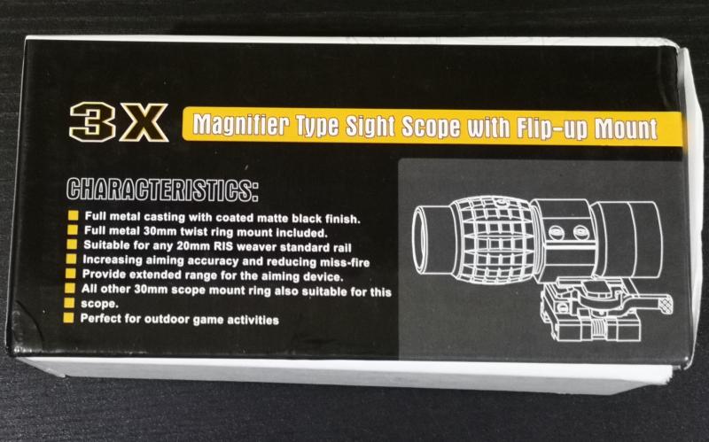 Vendo este magnificador 3x, con una lente un poco más grande de lo normal (30mm en lugar de 20mm), con anilla flip up para rail picatinny.