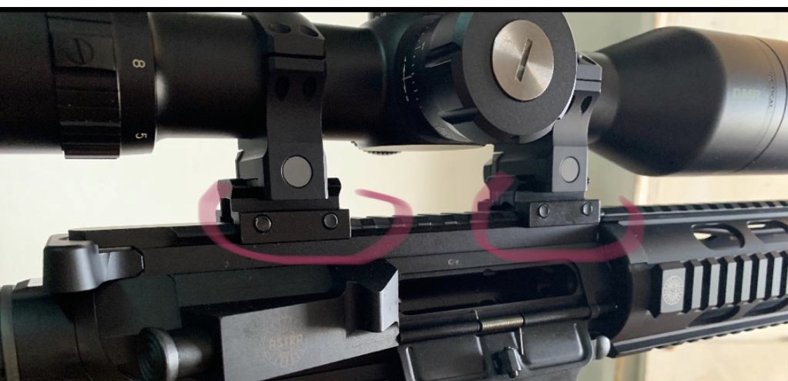 En un AR 15 de Picatinny muy largo, de esos que se extienden por debajo de la campana, como el de la segunda foto, hay que instalar las anillas con elevadores opcionales, para que la parte de abajo de la campana no pegue en la superior del Picatinny. Círculos rosas.