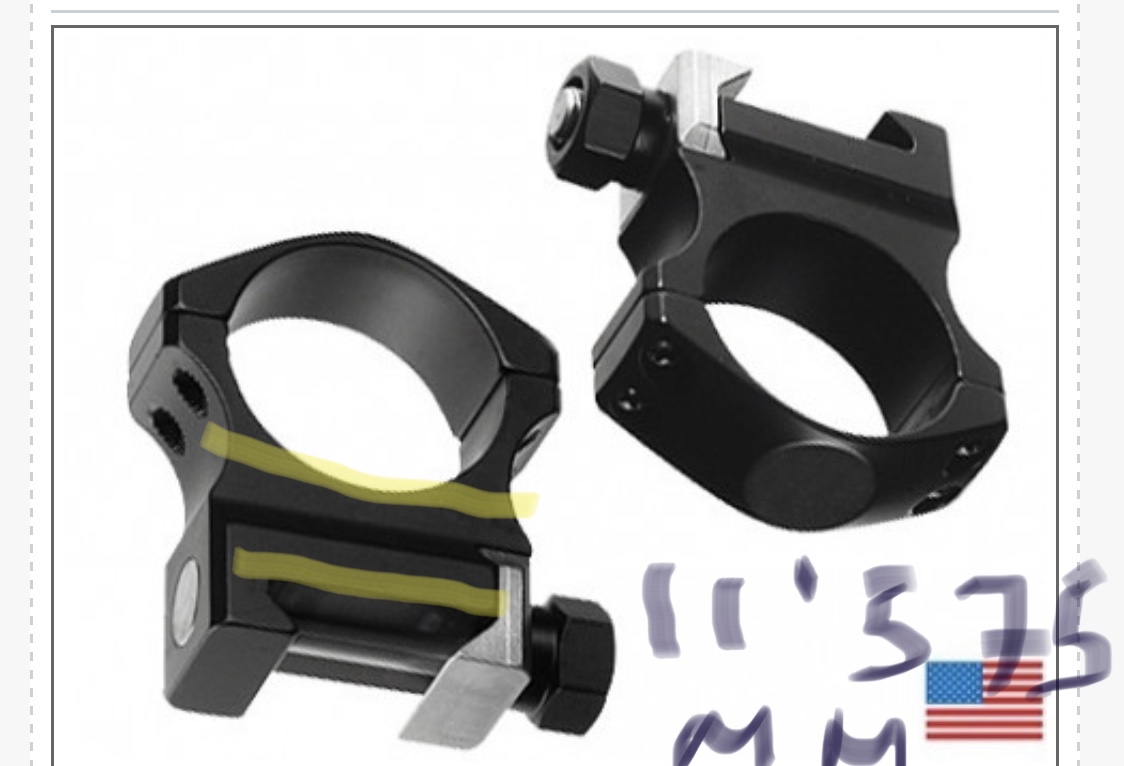 Como el tubo del visor tiene 34 mm de diámetro, la distancia desde la parte superior del carril Picatinny a la parte baja del aro interno de cada anilla es: 28,575 mm-34:2 mm = 28,57 mm-17 mm= 11,575 milímetros. Distancia entre las rayas amarillas de la primera foto.